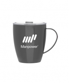 12 oz double wall 18/8 stainless steel thermal mug with copper vacuum insulation, clear acrylic push-on lid, and matching swivel; Hand wash recommended; Do not microwave; 4-7/16" h x 4"w (4-7/8 with handle) ; 355mL.