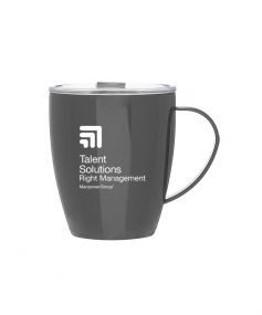 12 oz double wall 18/8 stainless steel thermal mug with copper vacuum insulation, clear acrylic push-on lid, and matching swivel; Hand wash recommended; Do not microwave; 4-7/16" h x 4"w (4-7/8 with handle) ; 355mL.