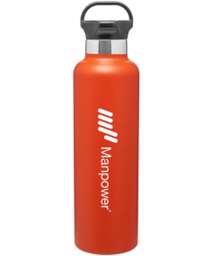 24 oz powder coated double wall 18/8 stainless steel thermal bottle with copper vacuum insulation, threaded gear-shaped insulated lid and carrying handle Complies with FDA, Prop 65. 11.25" H x 3" W