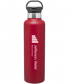 24 oz powder coated double wall 18/8 stainless steel thermal bottle with copper vacuum insulation, threaded gear-shaped insulated lid and carrying handle Complies with FDA, Prop 65. 11.25" H x 3" W