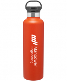 24 oz powder coated double wall 18/8 stainless steel thermal bottle with copper vacuum insulation, threaded gear-shaped insulated lid and carrying handle Complies with FDA, Prop 65. 11.25" H x 3" W