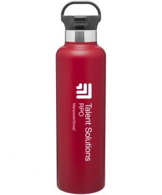 24 oz powder coated double wall 18/8 stainless steel thermal bottle with copper vacuum insulation, threaded gear-shaped insulated lid and carrying handle Complies with FDA, Prop 65. 11.25" H x 3" W