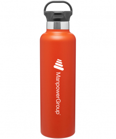 24 oz powder coated double wall 18/8 stainless steel thermal bottle with copper vacuum insulation, threaded gear-shaped insulated lid and carrying handle Complies with FDA, Prop 65. 11.25" H x 3" W