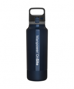 25 oz double wall 18/8 stainless steel thermal bottle with copper vacuum insulation, threaded one-touch push-button lid, locking mechanism, carrying handle, and rubberized base - patent pending - gift box included; Hand wash recommended; Do not microwave; 11 h x 3 w ; 739mL.