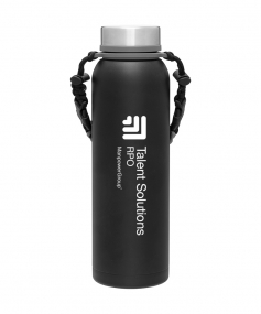 32 oz double wall 18/8 stainless steel thermal bottle with copper vacuum insulation, insulated stainless steel threaded lid, silicone ring, removable strap with buckles, removable clasps, and powder coated finish. Individual gift box. Hand wash recommended. Do not microwave. Complies with FDA, Prop 65. 11" H x 3.1875" W