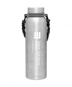 32 oz double wall 18/8 stainless steel thermal bottle with copper vacuum insulation, insulated stainless steel threaded lid, silicone ring, removable strap with buckles, removable clasps, and powder coated finish. Individual gift box. Hand wash recommended. Do not microwave. Complies with FDA, Prop 65. 11" H x 3.1875" W