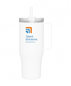40 oz double wall 18/8 stainless steel thermal mug with copper vacuum insulation, stainless steel rim, dual-purpose push-on clear lid, matching sliding closure, flexible wide silicone straw, and powder coated finish. Individual gift box. Hand wash recommended. Do not microwave. Complies with FDA, Prop 65. 9.75" H x 4" W
