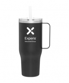 40 oz double wall 18/8 stainless steel thermal mug with copper vacuum insulation, stainless steel rim, dual-purpose push-on clear lid, matching sliding closure, flexible wide silicone straw, and powder coated finish. Individual gift box. Hand wash recommended. Do not microwave. Complies with FDA, Prop 65. 9.75" H x 4" W