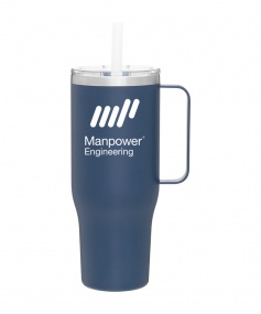 40 oz double wall 18/8 stainless steel thermal mug with copper vacuum insulation, stainless steel rim, dual-purpose push-on clear lid, matching sliding closure, flexible wide silicone straw, and powder coated finish. Individual gift box. Hand wash recommended. Do not microwave. Complies with FDA, Prop 65. 9.75" H x 4" W