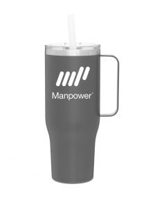 40 oz double wall 18/8 stainless steel thermal mug with copper vacuum insulation, stainless steel rim, dual-purpose push-on clear lid, matching sliding closure, flexible wide silicone straw, and powder coated finish. Individual gift box. Hand wash recommended. Do not microwave. Complies with FDA, Prop 65. 9.75" H x 4" W
