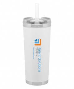 24 oz double wall 18/8 stainless steel thermal tumbler with copper vacuum insulation, stainless steel rim and base, threaded Eastman Tritan lid, snap closure, straw opening, and flexible wide silicone straw.