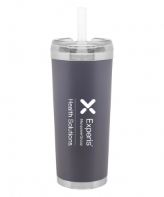24 oz double wall 18/8 stainless steel thermal tumbler with copper vacuum insulation, stainless steel rim and base, threaded Eastman Tritan lid, snap closure, straw opening, and flexible wide silicone straw.