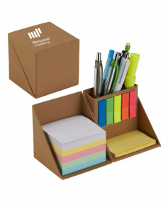 Features 5 colorful sticky flags for page marking, 1 pad of yellow (2" x 3") sticky notes and 5 colors of (3" x 3") note pad cube. Cube made from cardboard. 3 1/2" H x 3 1/2" W x 3 1/2" D