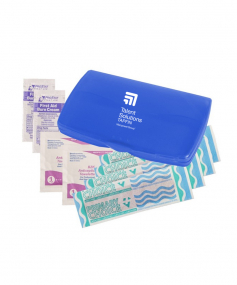Ultra-trim case contains 4-latex-free bandages, 2-antiseptic towelettes and 2-first aid cream packets. Complies with Prop 65. 2 9/16" W x 4 1/8" H x 1/2" D